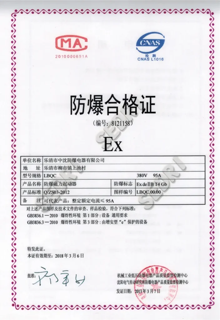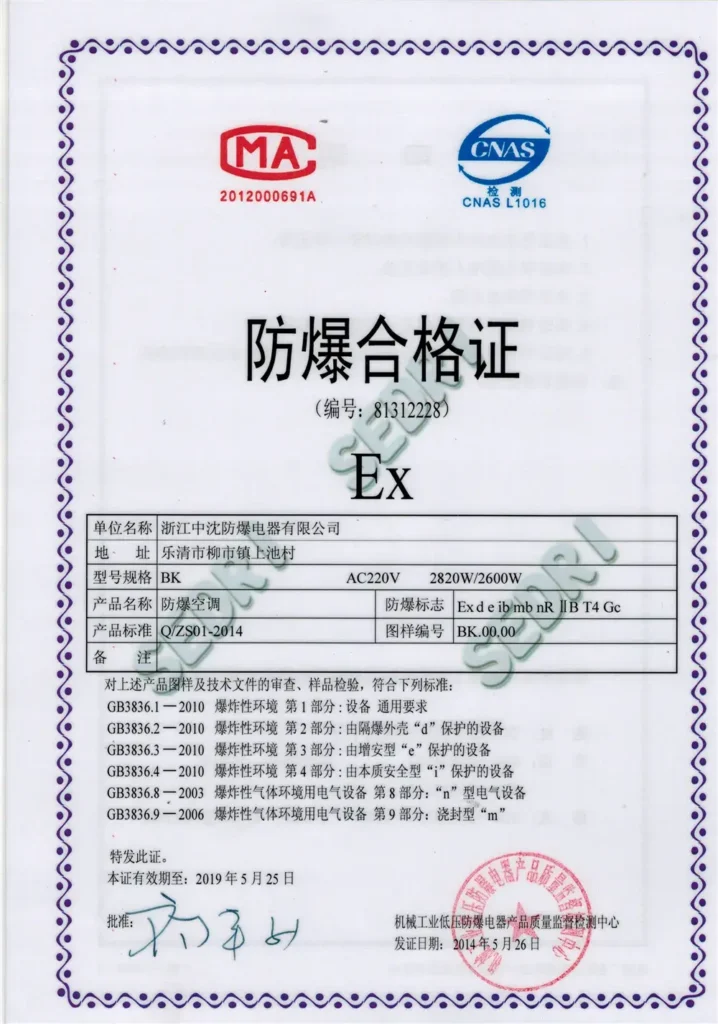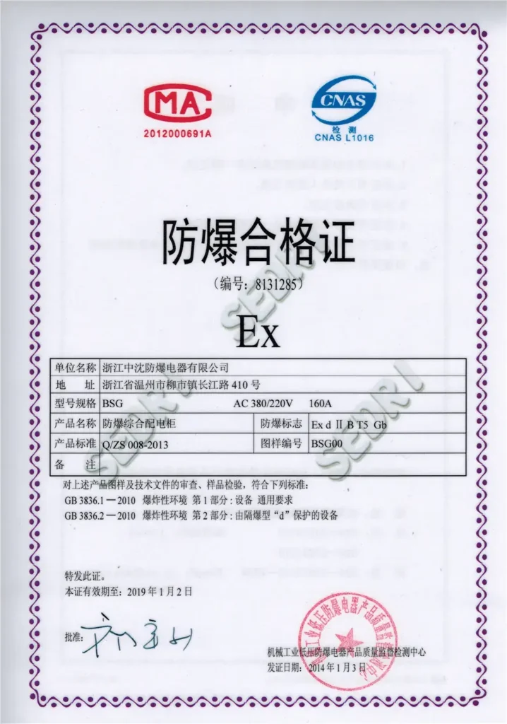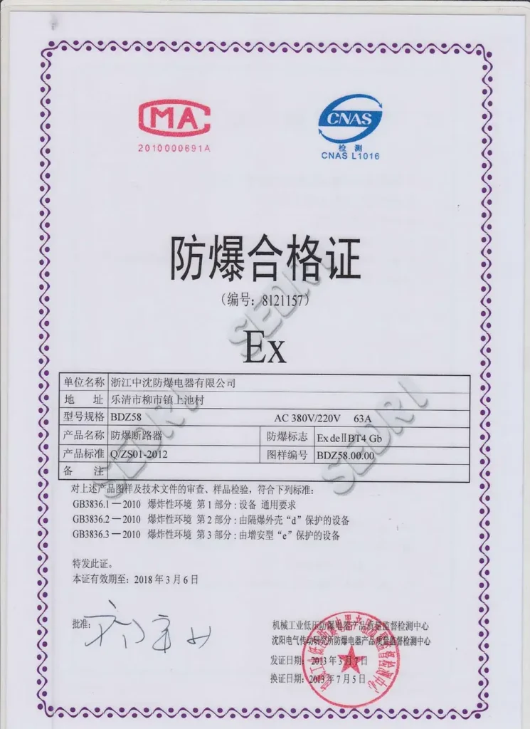 Ex-ZS explosion-proof products are manufactured under strict quality control systems and comply with national and international hazardous area standards. Our certifications cover explosion-proof lighting, control equipment, enclosures, and conduit fittings for Zone 1, Zone 2, and dust environments.